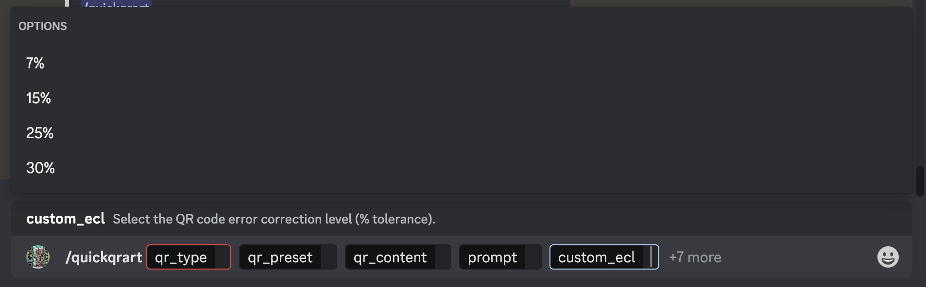 `custom_ecl`: Select QR code error correction level (% tolerance, 7%, 15%, 25%, 30%, default is 30%).