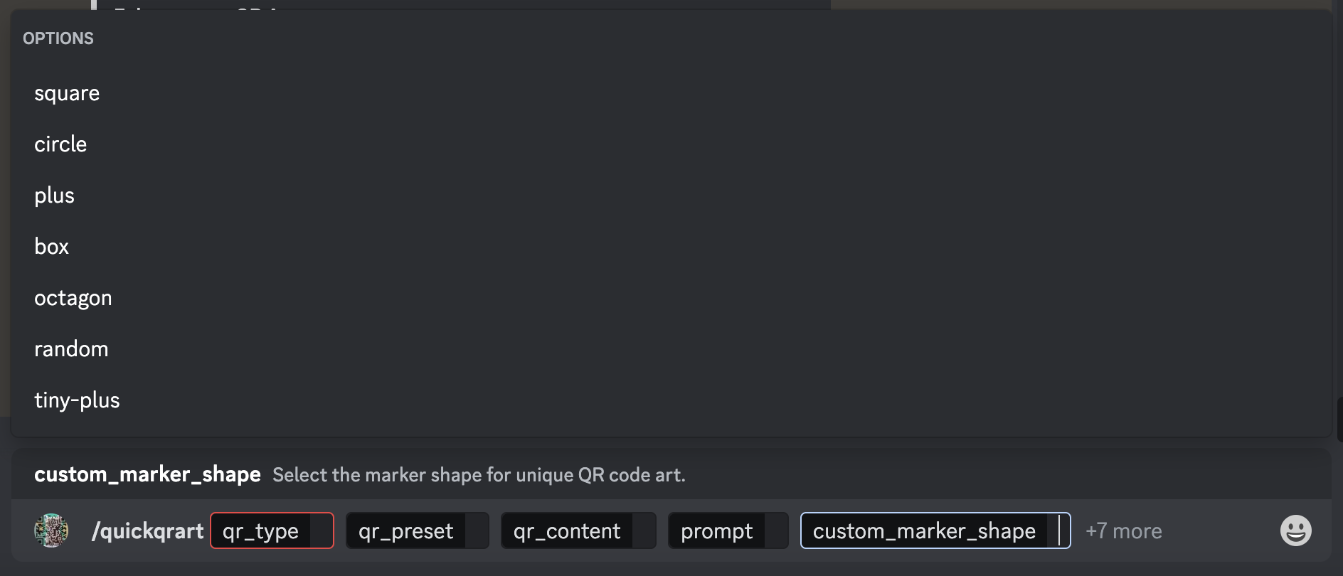 `custom_marker_shape`: Select marker shape for unique QR code art (square, circle, plus, box, octagon, random, tiny-plus).