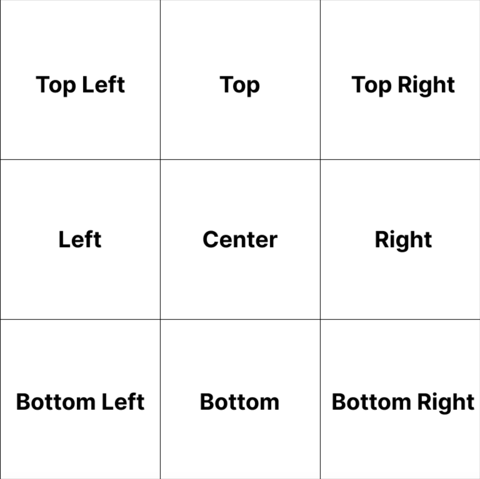 <table><thead><tr><th width="249" align="center">Position</th><th width="605" align="center">--pos value</th></tr></thead><tbody><tr><td align="center">Top Left</td><td align="center">--pos top-left</td></tr><tr><td align="center">Top</td><td align="center">--pos top</td></tr><tr><td align="center">Top Right</td><td align="center">--pos top-right</td></tr><tr><td align="center">Left</td><td align="center">--pos left</td></tr><tr><td align="center">Center</td><td align="center">--pos center</td></tr><tr><td align="center">Right</td><td align="center">--pos right</td></tr><tr><td align="center">Bottom Left</td><td align="center">--pos bottom-left</td></tr><tr><td align="center">Bottom</td><td align="center">--pos bottom</td></tr><tr><td align="center">Bottom Right</td><td align="center">--pos bottom-right</td></tr><tr><td align="center">Custom</td><td align="center">--pos (x,y)</td></tr></tbody></table>